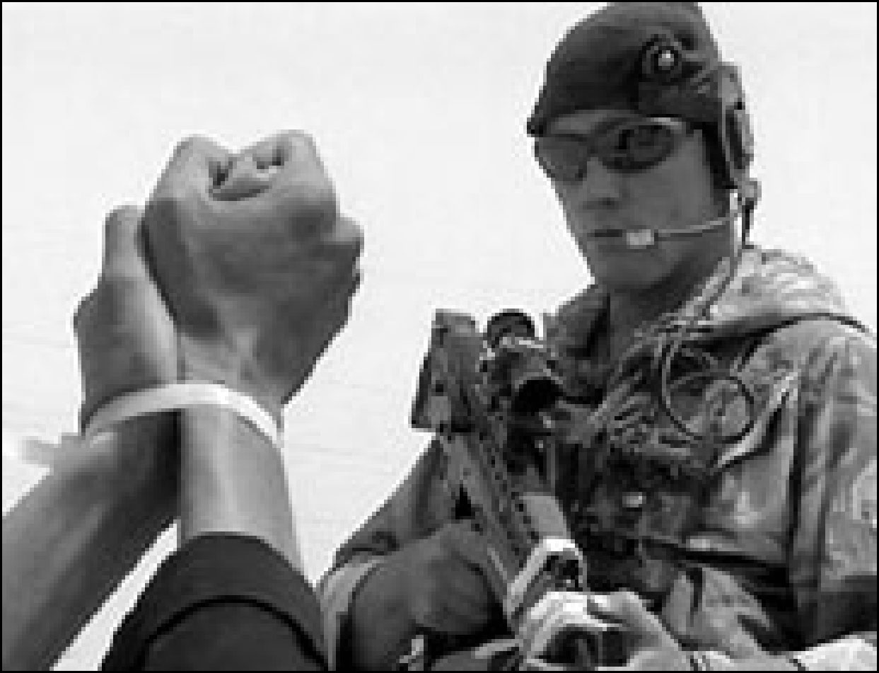Horrific pictures showing torture of Iraqi prisoners at the hands of US military personnel in Abu Ghraib prison gained world-wide attention in the last few days of April 2004. These photographs, which were broadcast on the US program 60 Minutes and made the front page of newspapers in the US, Britain and Europe, show US soldiers posing alongside naked Iraqi prisoners stacked in human pyramids and forced to engage in sexual acts with each other. One prisoner was shown hooded and draped in a long black cape with electrical wires connected to his hands. He was told, according to his captors, that if he fell from the pedestal on which he was standing he would be electrocuted.