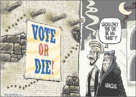 What kind of election could that of 30 January 2005 in Iraq have been? Foreign troops and their local proxies occupied the country, actively fought by a strong resistance movement. The attendant restrictions on travel and access to resources prevented prospective voters from acquiring information on issues and candidates that would enable them to vote intelligently. Many of the same security concerns just led to yet another postponement of Afghanistan’s parliamentary elections. Campaigning was constrained by the security situation, divorcing candidates from constituency—conveniently for political operatives who wrapped themselves in one banner or another but whose covers could not stand much pulling—and made the contest more one of money than ideas. The occupation authorities or their quislings largely controlled the limited media available—Al Hurra TV, for example, financed by the U.S., Al Nahrain Radio, sponsored by the Iraqi Interim government, and “Your Voice,” a radio talk show supported by the U.S. military. And only groups with money and influence could engage in significant postering and leafleting—which could not be much more than sloganeering in any event. Instead of an informed preference, people were forced to vote (or not) according to imposed identities—the Americans, Iranians, and others being variously blamed for importing such identity politics into Iraq where they had traditionally been of such little importance.
