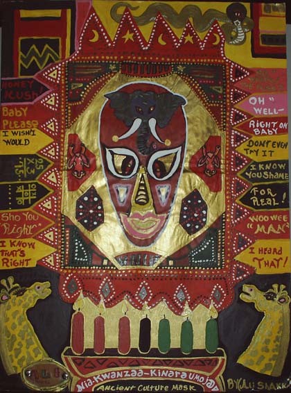 As you can see there are many animals in the background (elephant, wildebeest, cobra snake, and the majestic Giraffe whom is very gentle but has an deadly kick). The Giraffe is the tallest mammal of living four-footed animals. The mask is an African Culture mask used in dance, celebrations of the harvest, the rain, sun thanking (God) Allah for his blessings.