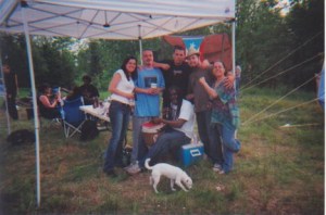 Sekou came through with over twenty pounds of rainbow trout he and his fishing buddy had caught over the previous week. They set up their own grill and treated folk with some marvelous fish plates. See flick…Sally arrived around the same time with Richards oldest son Richard jr. his wife and their son. They flew in from Cali. wasting no time setting up their tent. We had an area of 60 yards wide and 100 yards long, surrounded by trees. Netdahe and Russell cleared the area with some rigged up stick and blade. They had dug a pit ten feet in circumference for a fire. Early in the afternoon Henekis set up a collagbe of pictures of her father’s life inside and out. Then we made a table for the urn. See flicks…