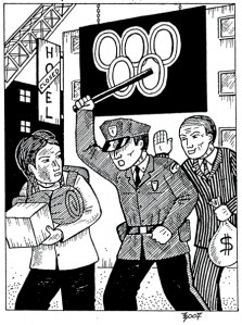 Due to massive construction projects associated with the Olympics, from venues to infrastructure, there is both widespread environmental destruction, as well as huge public debts. As part of security operations, police, military, and intelligence agencies receive millions of dollars for new personnel, equipment, weapons, et cetera—strengthening the creeping police states we see around the world (and south of the border) and further eroding our alleged “freedoms” and civil liberties.